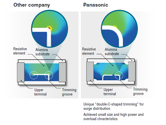 Panasonic offers a wide range of high-power, anti-surge resistors, designed and tested to be used in a variety of applications. The Anti-Surge Thick Film Chip Resitors ERJP series has a unique trimming shape for surge distribution, as well as proven small size and high power and overload characteristics. Excellent heat dissipation with optimized resistance pattern and resistance material, and the electrode design enables downsizing and a highpower rating.