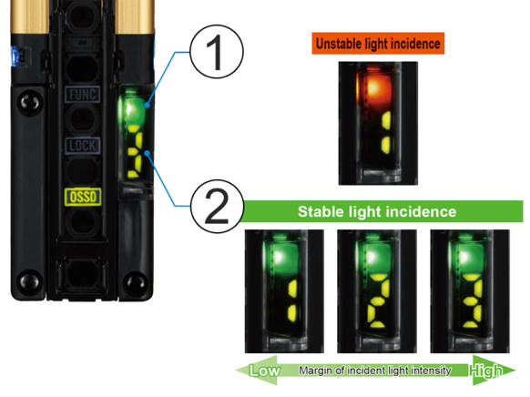 The incident beam intensity indicator (also called stable-light-reception indicator) helps to adjust the beam during installation and to control the light quality during operation. The amount and quality of the light received is indicated by the LED color and a one-digit display. When the LED lights up in orange, the light is unstable. Stable light is indicated by a green LED. The numbers displayed range from 1 to 3. The higher the number, the more stable the light. This way, it is easy to discover and remove errors caused by dirt on the detection surface or beam misalignment.